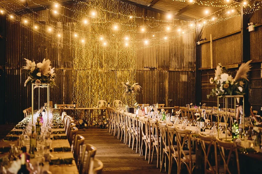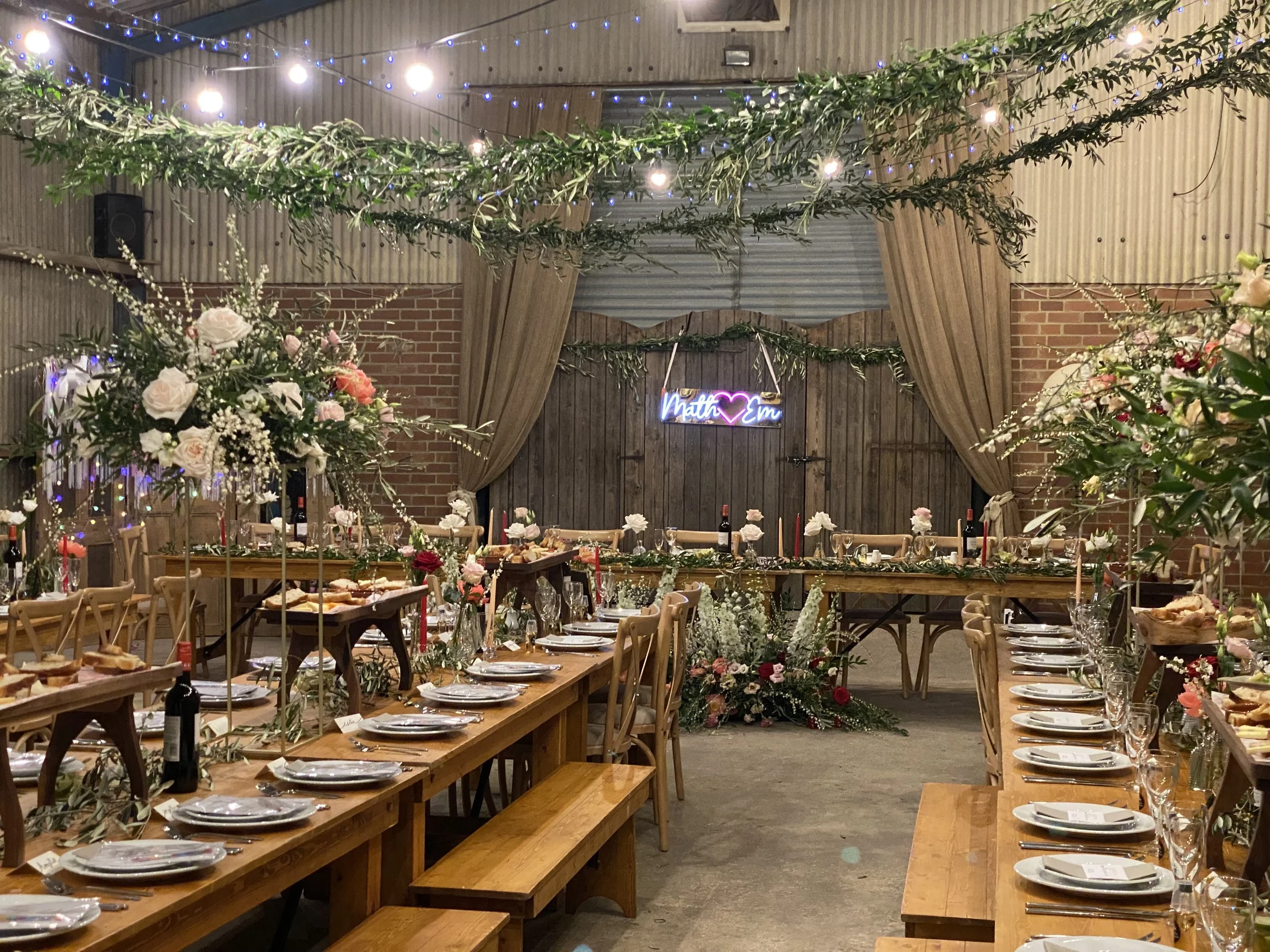 After walking through the courtyard, you reach the corn store. It can seat 160 on long or round tables. It’s big, industrial, impressive and has the flow of fairylights down the back wall. You can also get married in there with the fairy lights as your backdrop. It even has enough room for crazy golf or games, bucking bronco, etc., if the weather is bad and you can’t have them on the paddock.